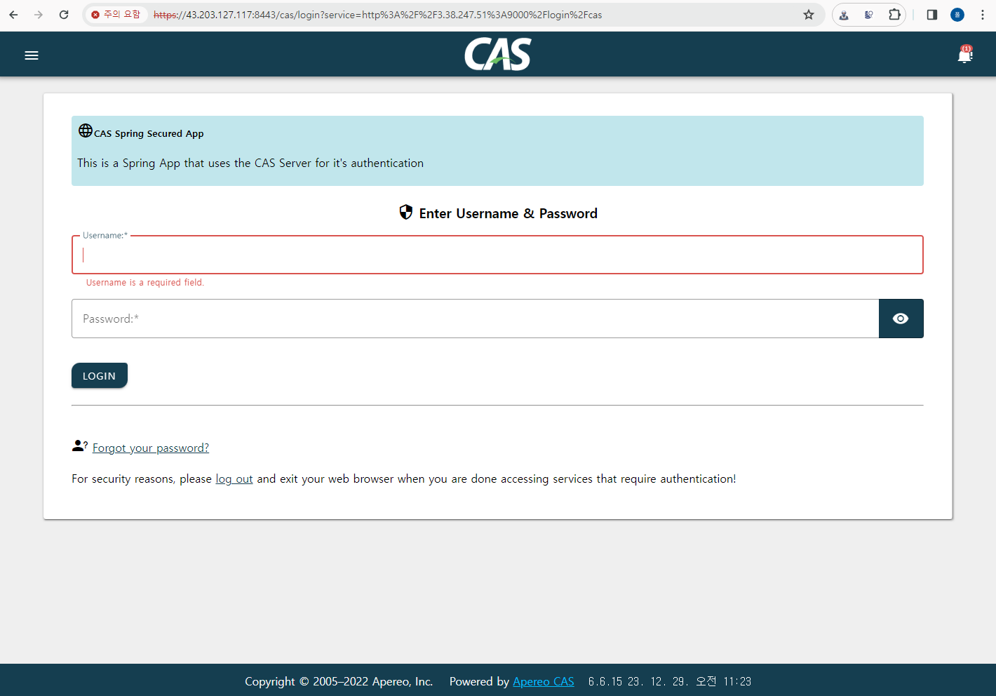 이 페이지가 뜬것만으로도 우리는 해당 서비스가 CAS 서버에 잘 적용되었다는 것을 알 수 있습니다.