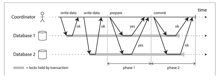 2PC는 two phase commit 의 약자로서 쉽게 설명해서 각각의 트랜잭션을 커밋하기 전에 모든 트랜잭션이 준비완료를 외치기 전까지 커밋을 미루는 알고리즘입니다.