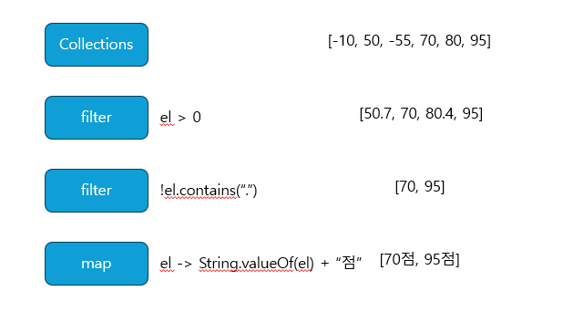 StreamAPI에서 말 그대로 "stream" 즉, 흐름처럼 메서드를 타고 들어가는게 특징입니다. 예를 들어서