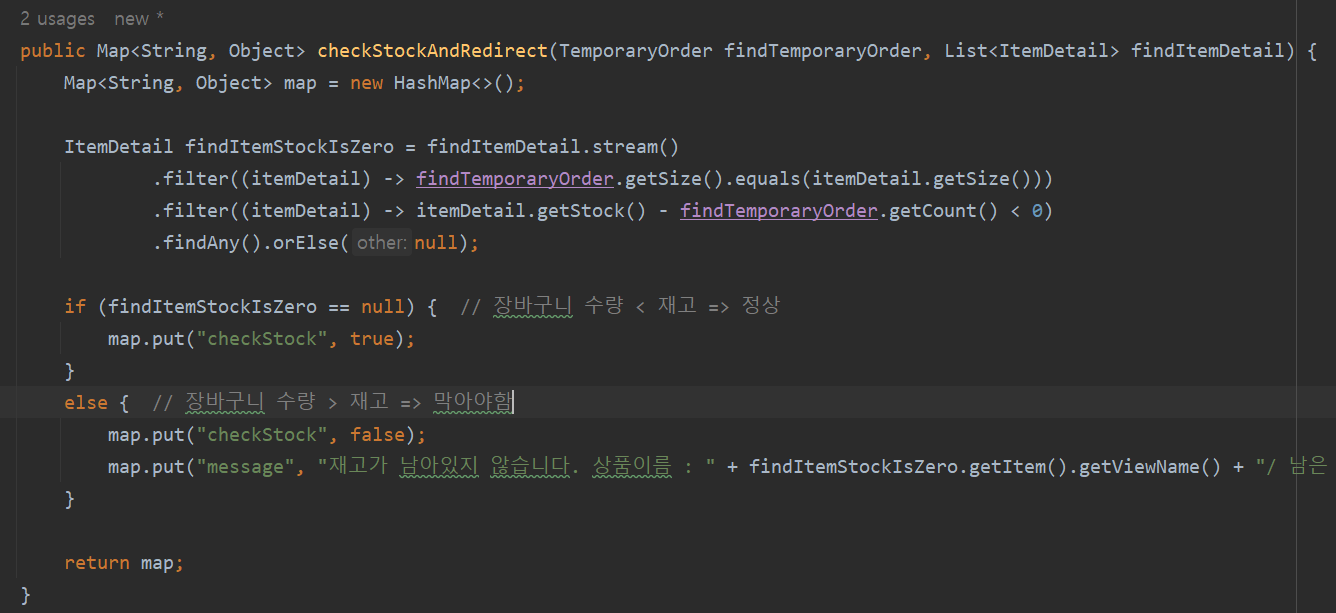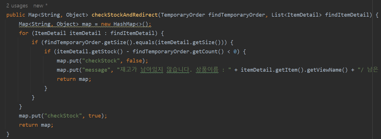 만약 그런 상황이라면 재고가 남아있지 않는다는 메시지를 띄워주기위해 설계한 로직입니다.