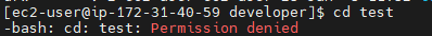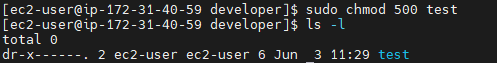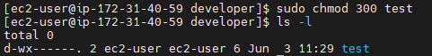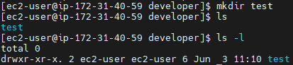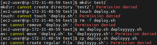 기본적으로 파일이나 폴더를 만들면 상태는 rwxr-xr-x입니다. 폴더를 소유한 ec2-user와 폴더를 소유한 그룹인 ec2-user는 이 파일에 대한 권한을 나눠받습니다.