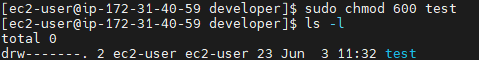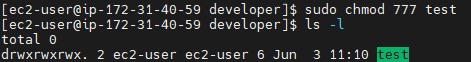 기본적으로 파일이나 폴더를 만들면 상태는 rwxr-xr-x입니다. 폴더를 소유한 ec2-user와 폴더를 소유한 그룹인 ec2-user는 이 파일에 대한 권한을 나눠받습니다.