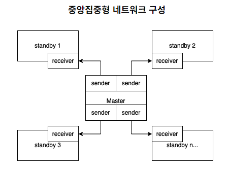 스트리밍 레플리케이션이라는 이름에 걸맞게 데이터를 스트리밍하듯이 전송하기 때문에 자연스럽게 중앙집중형 네트워크를 구성하게됩니다.