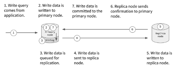 - 비동기 레플리케이션 : MySQL에선 마스터 노드에 binlog (binary log) 라는 로그파일이 있고 이 로그 파일엔 어떤 데이터가 조작되었는지 low level로 적혀있습니다. 이 binlog를 다른 레플리카에 전달함으로써 레플리카는 마스터 노드에서 벌어진 데이터 흐름을 파악할 수 있습니다.