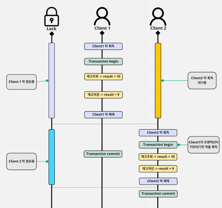 이렇게 락을 해제하고 커밋을 하게 되면 Client2가 락을 획득하고 트랜잭션을 시작했을 때 값이 맞지않아 문제가 생길 수 있습니다. 네, race condition이죠.