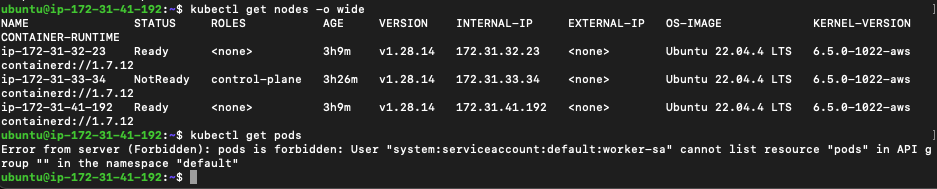 이렇게 쿠버네티스 워커 노드에 권한을 부여해봤습니다. 사실 모든 권한을 다 주는 것이 편하지만 실제 환경을 구축해봄으로서 조금 리얼한 실습을 할 수 있었습니다.