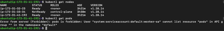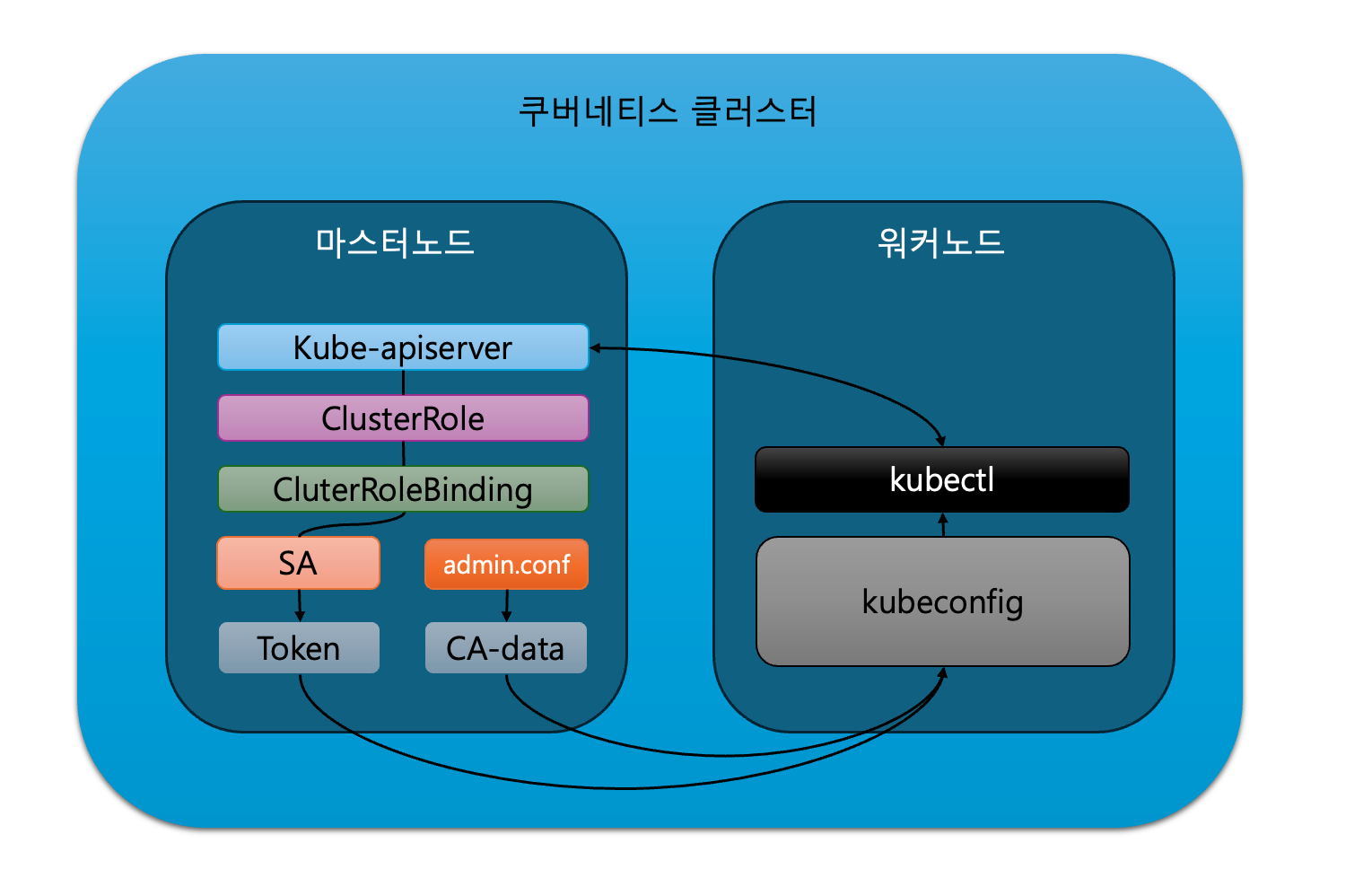 워커 노드에서 kubectl 명령어를 사용하기 위해서 저는 kubeconfig와 Service Account (이하 SA) 를 조합해서 워커 노드에 권한을 부여했습니다.