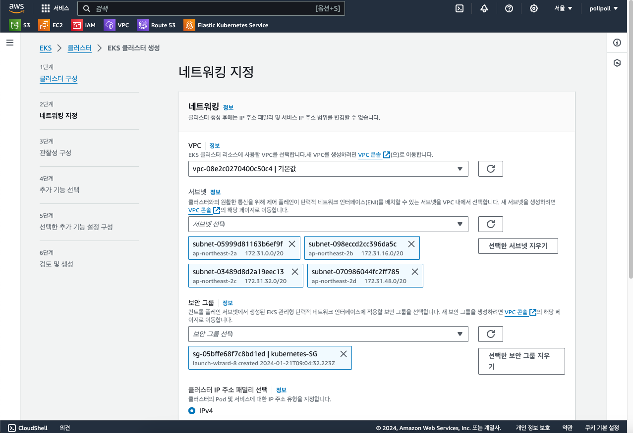 네트워크에 VPC를 선택하고 그 VPC안에 있는 서브넷을 선택해주면 됩니다. EKS를 위해서라면 최소 2개의 서브넷이 있어야합니다. 그리고 쿠버네티스 클러스터에 접근을 위한 보안 그룹을 설정해줘야합니다.