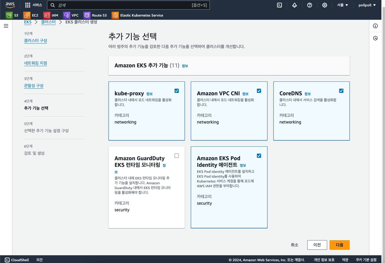 추가 기능을 선택할 때는 디폴트로 위의 사진처럼 네개가 선택되어있습니다. EKS Pod Identity는 파드에 접근하는 권한을 IAM으로 관리할 수 있도록 해주는 것인데 저는 일단 로컬PC인 맥북에서 클러스터에 접근할 거고 그 클러스터에 대한 접근을 IAM으로 관리할 것이지 파드에 관해서는 IAM이 필요없어서 선택하지 않았습니다.
