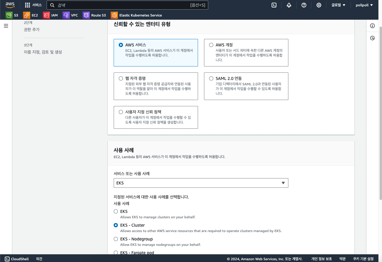 신뢰할 수 있는 유형을 AWS 서비스로, 그리고 서비스에 EKS를, 사용 사례에는 EKS -Cluster를 선택합니다.