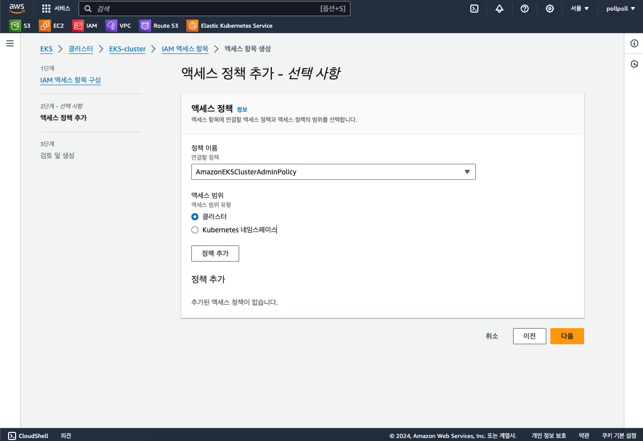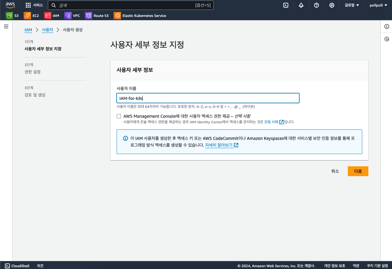 그리고 이제 IAM으로 붙어볼건데요. 이제 이 클러스터에 접근해서 AWS의 서비스들을 이것저것 조작하기 위해서 IAM 사용자를 만들어줄겁니다.