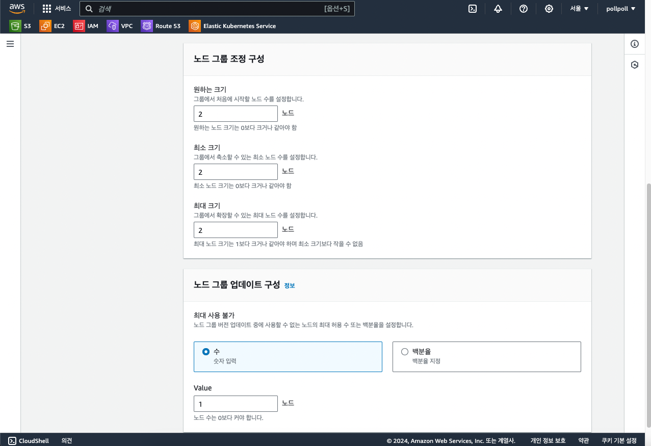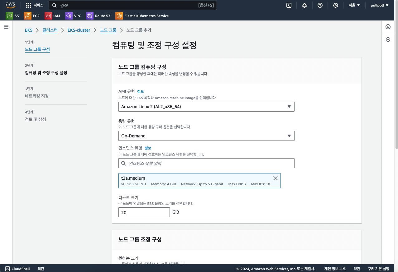 이 화면에서 Kubernetes 레이블이라는 부분이 있는데 이 노드가 만들어질 때 어떤 라벨을 달고 있을지 결정하는 것입니다. 뒤에서 더 나오겠지만 노드그룹에는 몇개의 노드를 유지할 것인지 정할 수 있는데 이 노드마다 전부 라벨을 붙인 상태에서 노드가 추가되는 것입니다.
