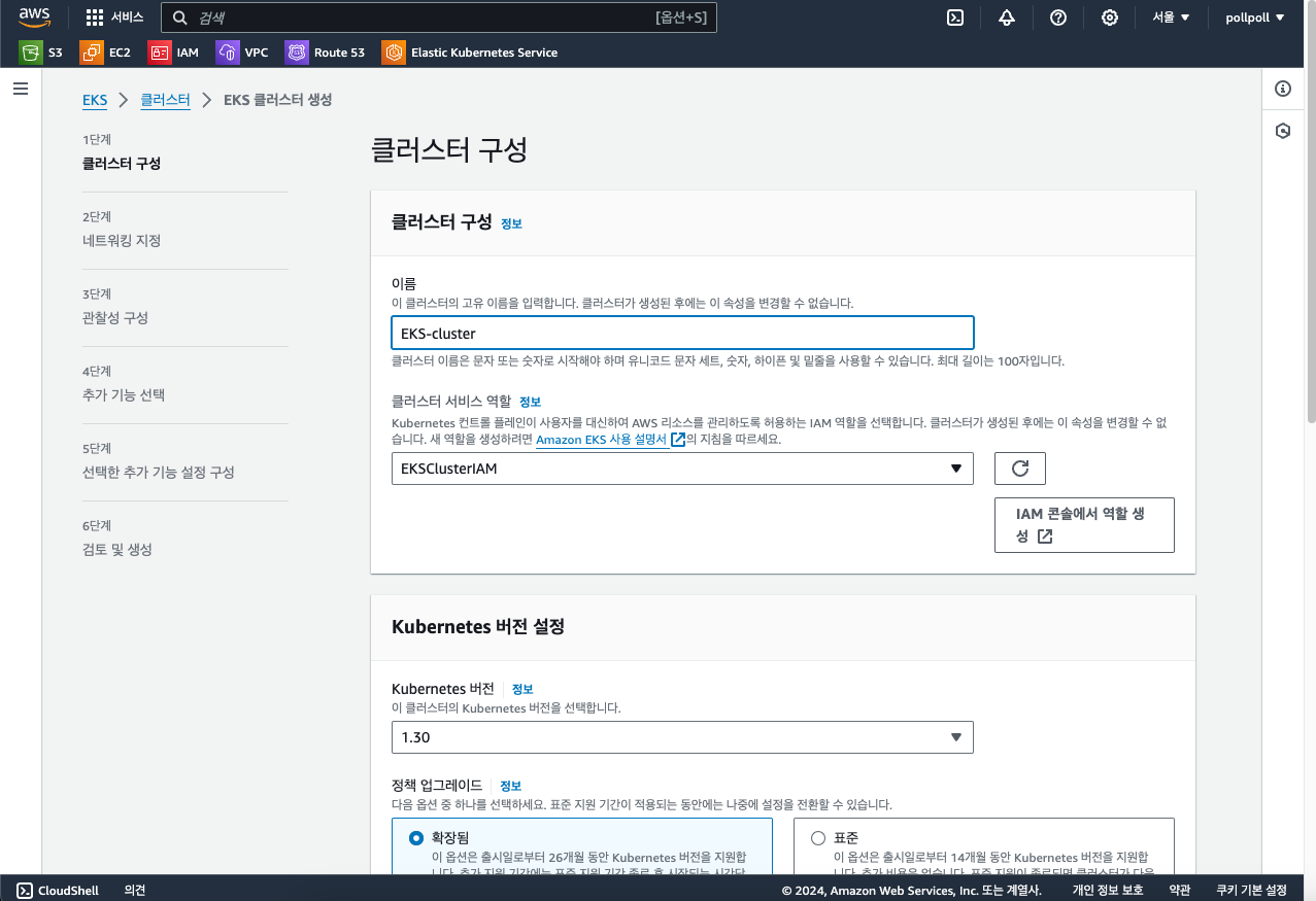 이름에 원하는 이름을, 클러스터 서비스 역할에 우리가 방금 만든 IAM Role을 넣고 쿠버네티스 버전을 설정합니다.
