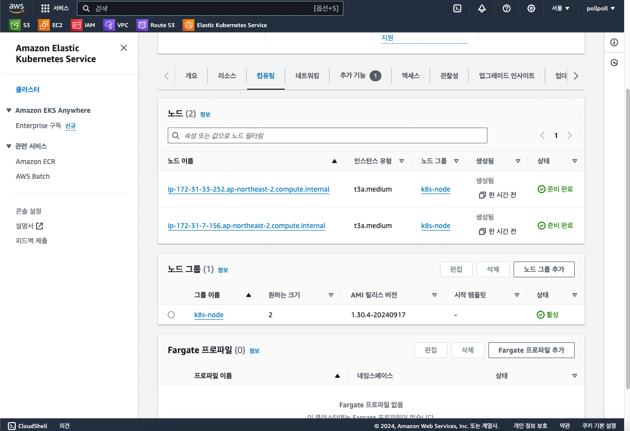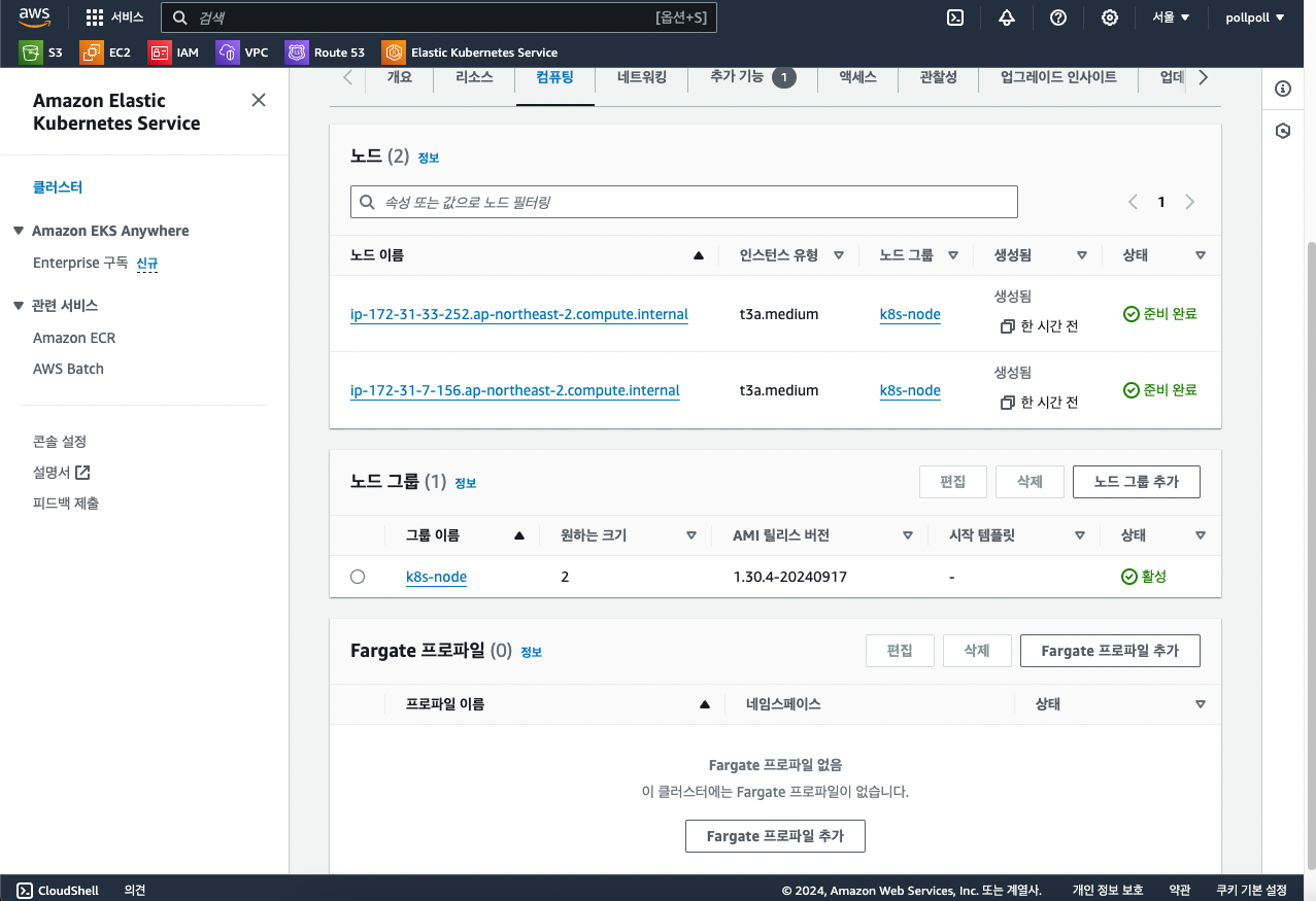 "컴퓨팅"탭에서 "노드 그룹 추가" 버튼을 클릭합니다. 저는 이미 만들어뒀습니다. 원래 이곳은 비어있는 공간입니다.