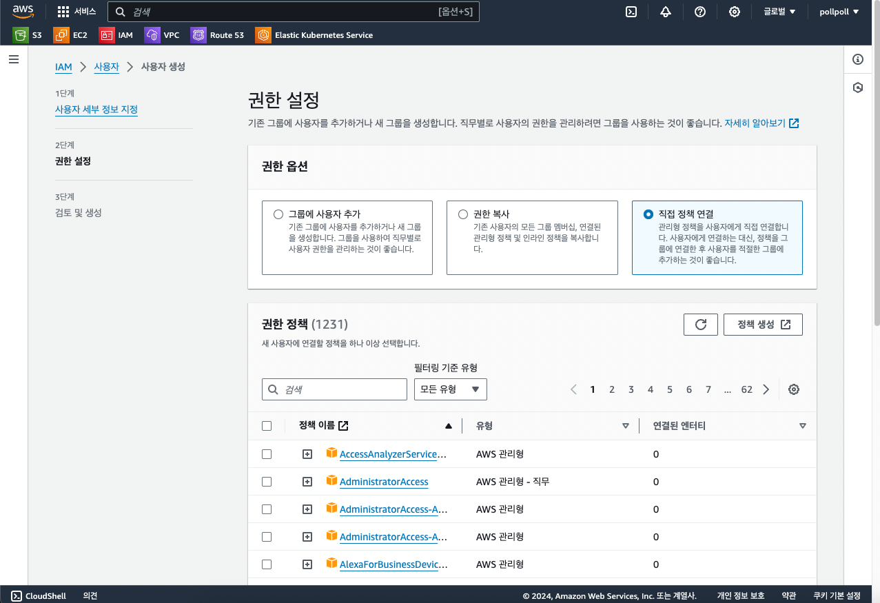 직접 정책 연결을 선택하고 권한 정책에서 검색을 통해 하나씩 체크박스를 선택해주면 되는데요.