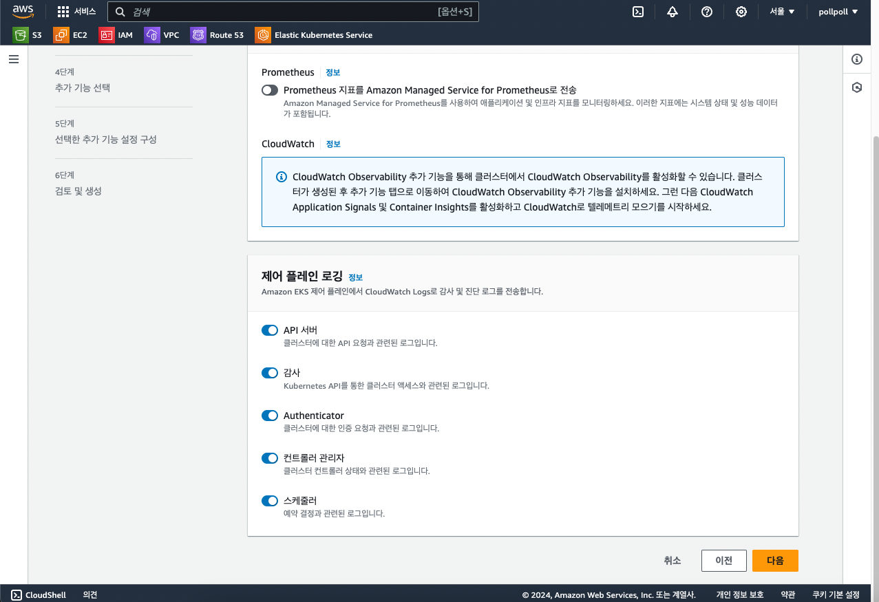 지표에 대한 설정은 추후에 CloudWatch와 연동할 수 있기 때문에 일단은 선택하지 않았고 Control Plane 로깅은 모두 선택해줍니다.