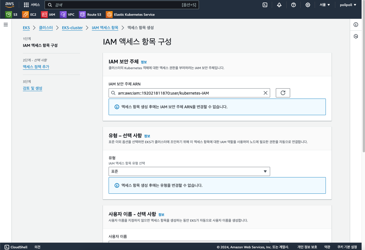 클러스터 내부에서 "엑세스" 탭에 "엑세스 항목 생성"을 선택합니다.