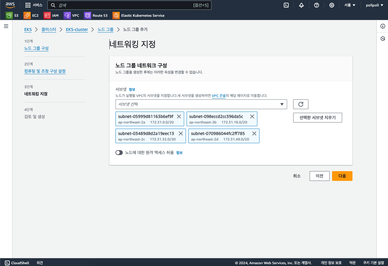 뒤이어 네트워크 구성을 선택해야하는데 맨처음 EKS 클러스터를 만들 때 VPC를 선택했기 때문에 어떤 서브넷에만 노드를 생성할 것인지 정하면 됩니다.