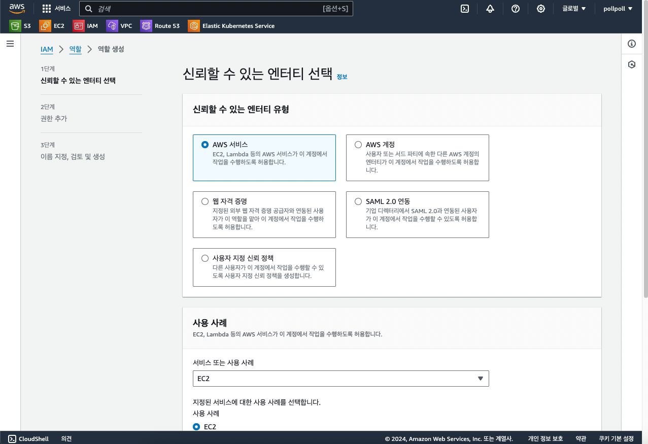 아까 EKS 역할을 만들었던것처럼 IAM > 역할 > 역할 생성을 누르고 EKS와 마찬가지로 신뢰할 수 있는 엔티티를 AWS 서비스로, 서비스, 사용 사례는 EC2를 선택해줍니다.