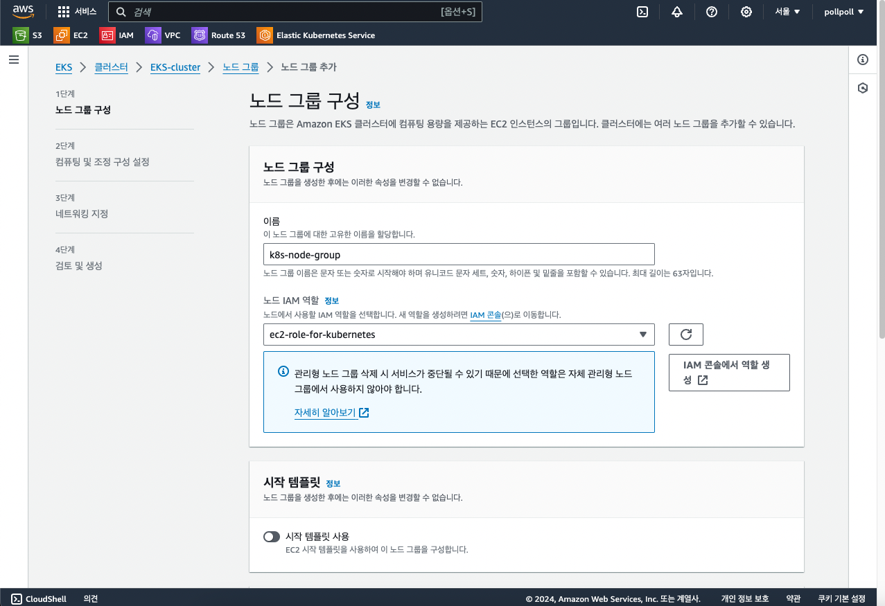 이름을 입력하고 노드 IAM역할에 방금 만든 역할을 선택하고 모두 디폴트로 설정합니다.