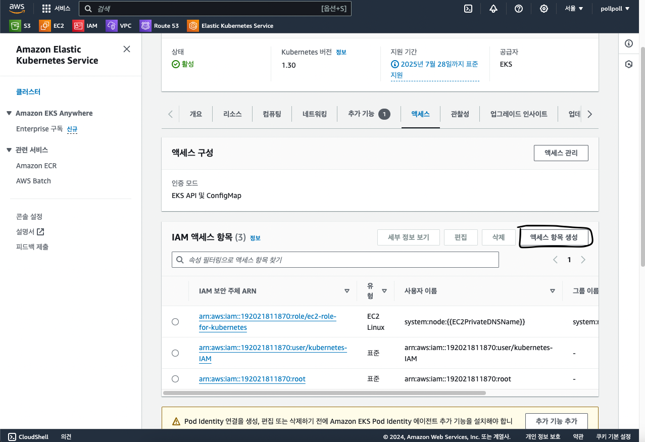 클러스터 내부에서 "엑세스" 탭에 "엑세스 항목 생성"을 선택합니다.