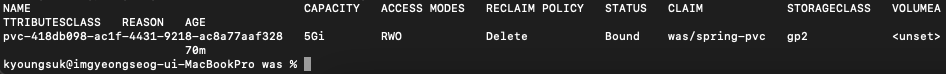 - volumeMounts에선 PV가 연결되었다는 것을 알아보기 쉽게 /was/storage로 설정했습니다.