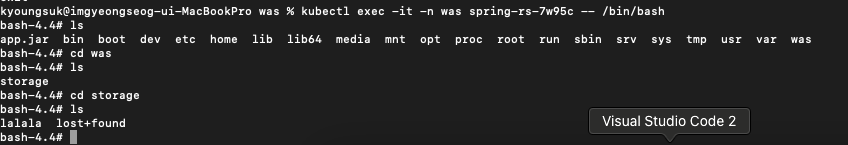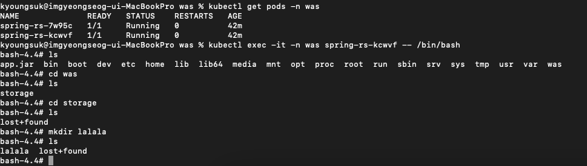 우선 첫번째로 들어간 파드에서 실제로 was폴더가 만들어져있었고 안에 들어가서 lalala 폴더를 하나 만들었습니다.