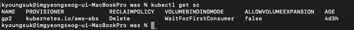 kyoungsuk@imgyeongseog-ui-MacBookPro was % kubectl get sc gp2 -o yaml