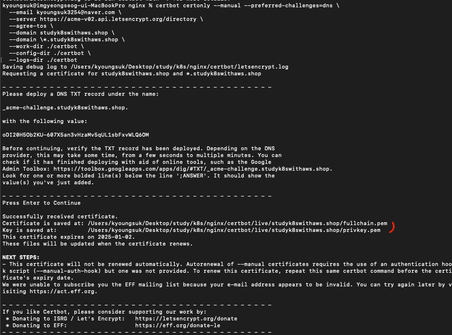 여기로 들어가면 fullchain과 privkey가 생깁니다. 해당 디렉토리로 이동한 다음 다음과 같은 명령어를 작성해줍니다.