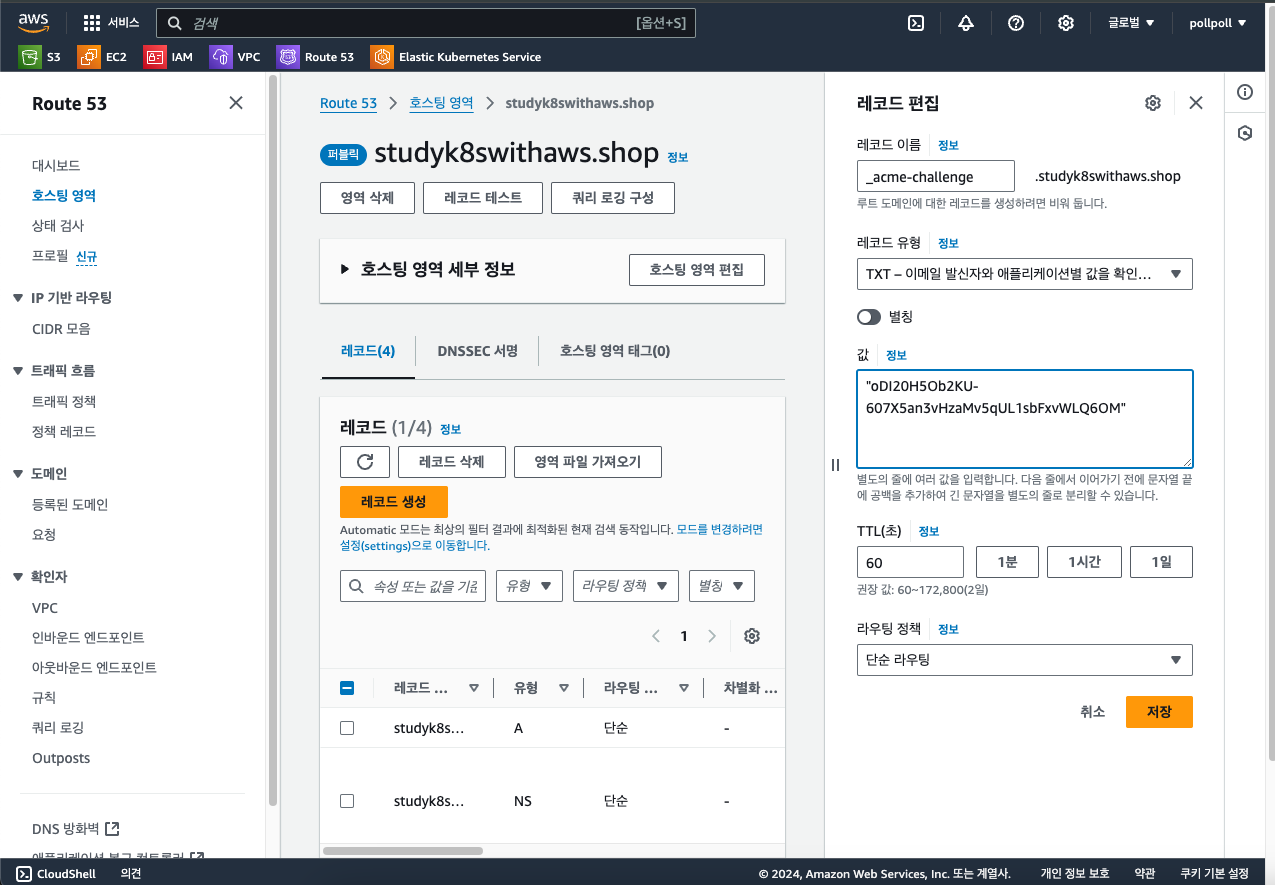그리고 letsencrypt에서 발급한 TXT레코드도 등록해야하니 이부분은 정확히 짚고 넘어가겠습니다.