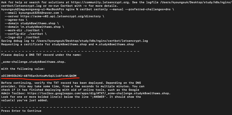 그리고 상태 확인을 통해 DNS에 전파되는 것을 확인하고 엔터를 눌러줍니다.