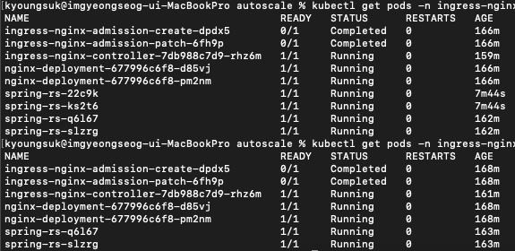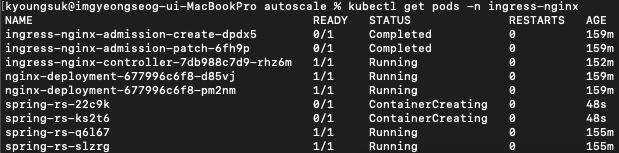 Nginx 파드 두개, 스프링 파드 두개, Nginx Ingress Controller 한개가 생성되어있습니다.