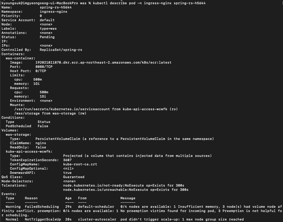 이렇게 Pending 상태에서 무한히 돌고있는 파드를 describe 명령어를 이용해서 확인해보면 volume node affinity conflict 라는 에러 메세지를 볼 수 있습니다.