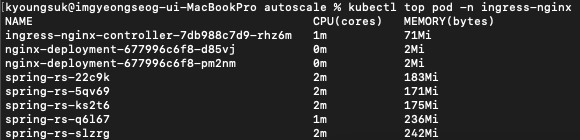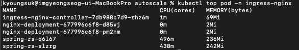 저는 스프링 파드의 limit을 0.5 코어로 주었기 때문에 더이상 올라가지 않는 것을 확인할 수 있었습니다.