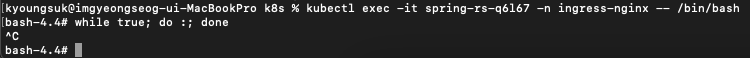 이 상태에서 exec 명령어로 스프링 파드 내부로 들어갑니다.