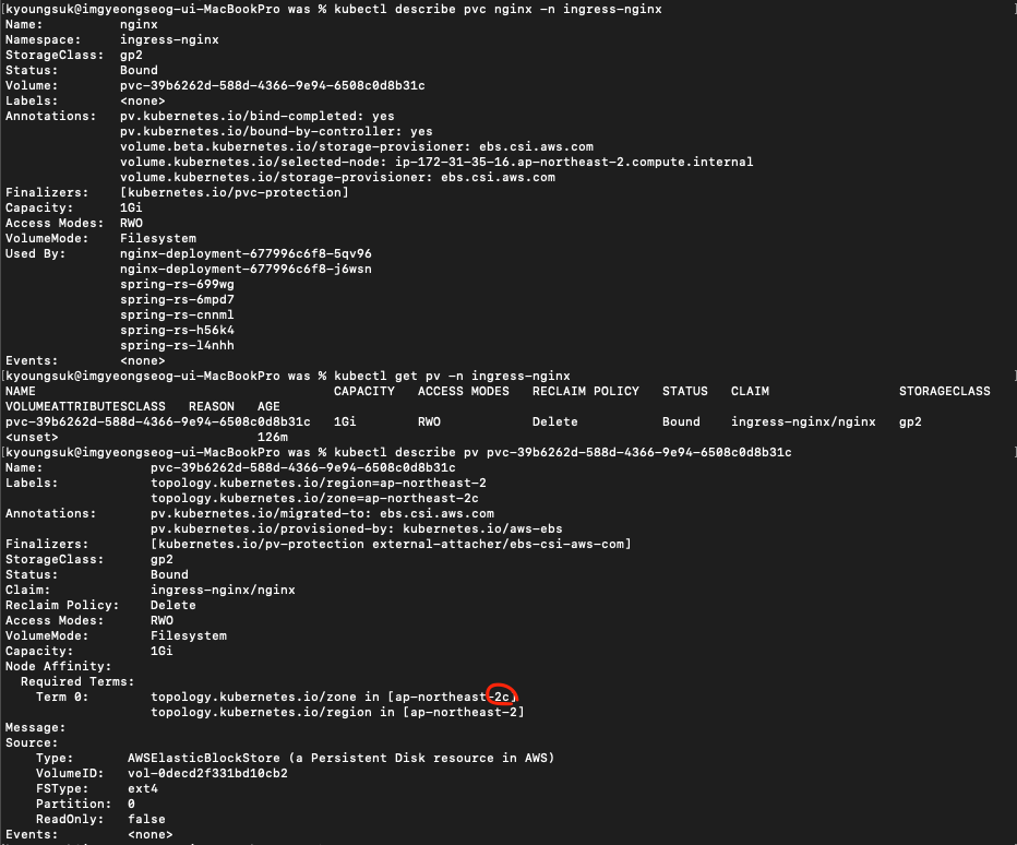PVC와 PV에 대한 describe도 확인해보면 해당 PV는 ap-northeast-2c에 생성되어있고 새롭게 생성된 노드가 만약 2c가 아닌 다른 리전에 생성되었다면 해당 PV가 노드와 연결되지 않아 파드 자체가 생성되지 않는 것이죠.