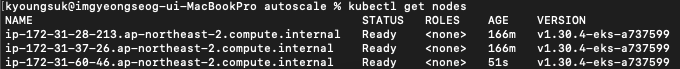 저는 EKS의 노드그룹의 설정으로 최대 노드 수를 3으로 설정해 실습을 위한 최소 비용만을 사용하도록 했습니다.
