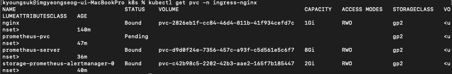 이렇게 잘 되는 것을 확인할 수 있는데 이때 prometheus-server와 prometheus-alertmanager가 Pending 상태일 수 있습니다. 이건 PVC와 연결이 안되서 그런 것이므로 PVC를 확인해보면 됩니다.