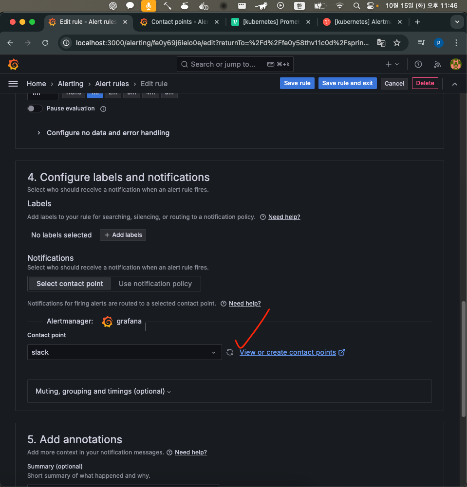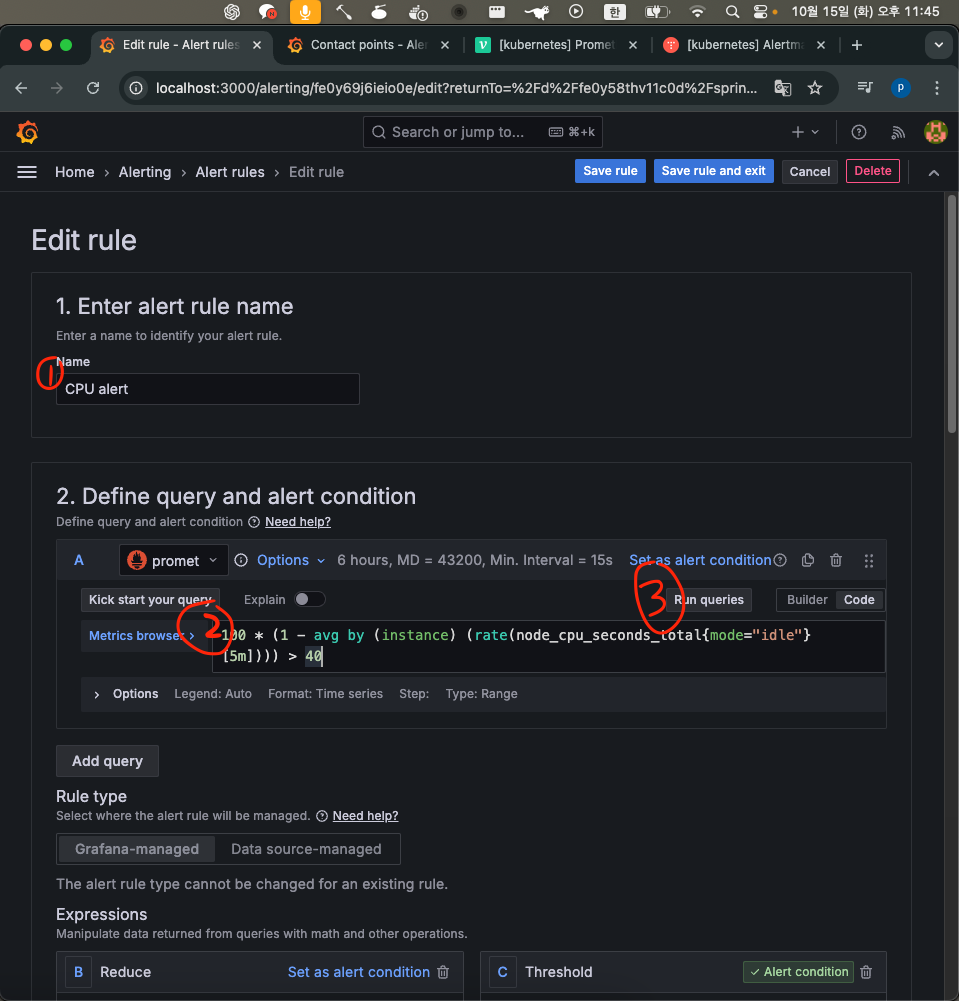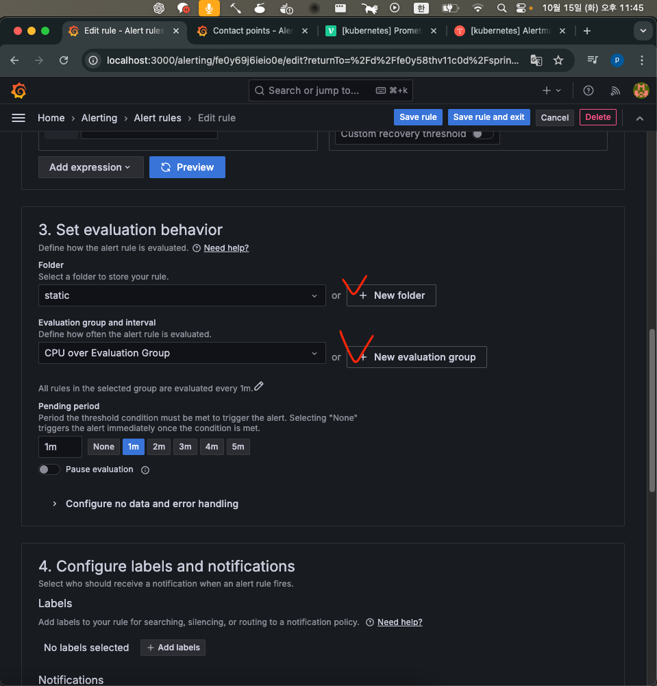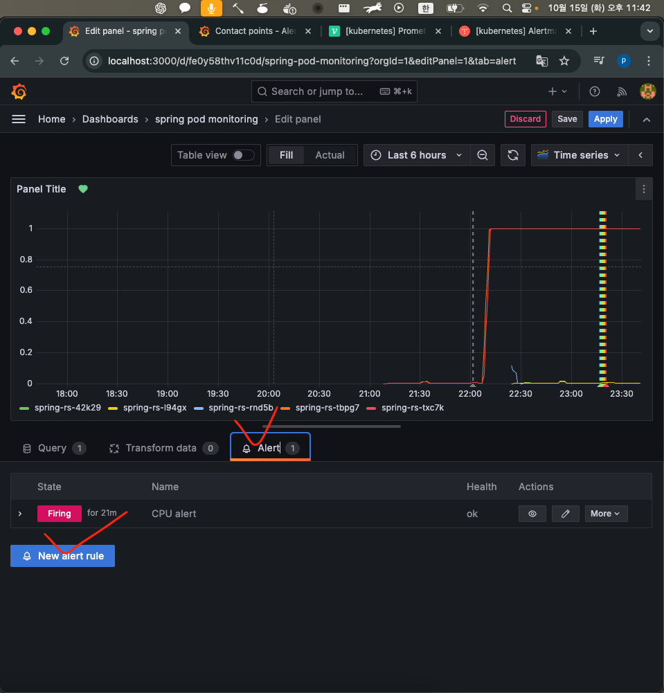 이전 포스팅의 그 대시보드 오른쪽에 Alert가 있는데 Alert는 대시보드를 저장하면 사용할 수 있습니다. New alert rule을 선택하면?