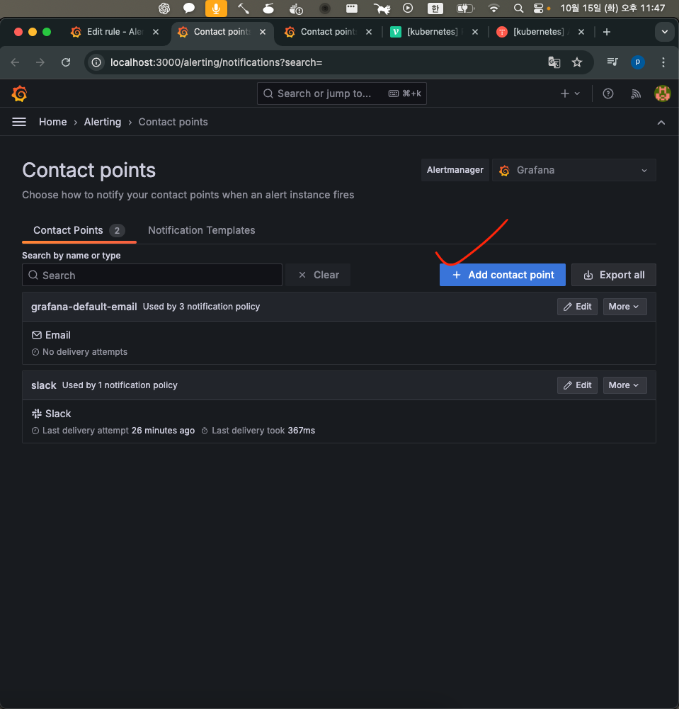 만약 프로메테우스를 helm으로 설치하였다면 alertmanager가 같이 들어가있을텐데요. 이전 포스팅과 다른 점이 바로 이부분입니다.