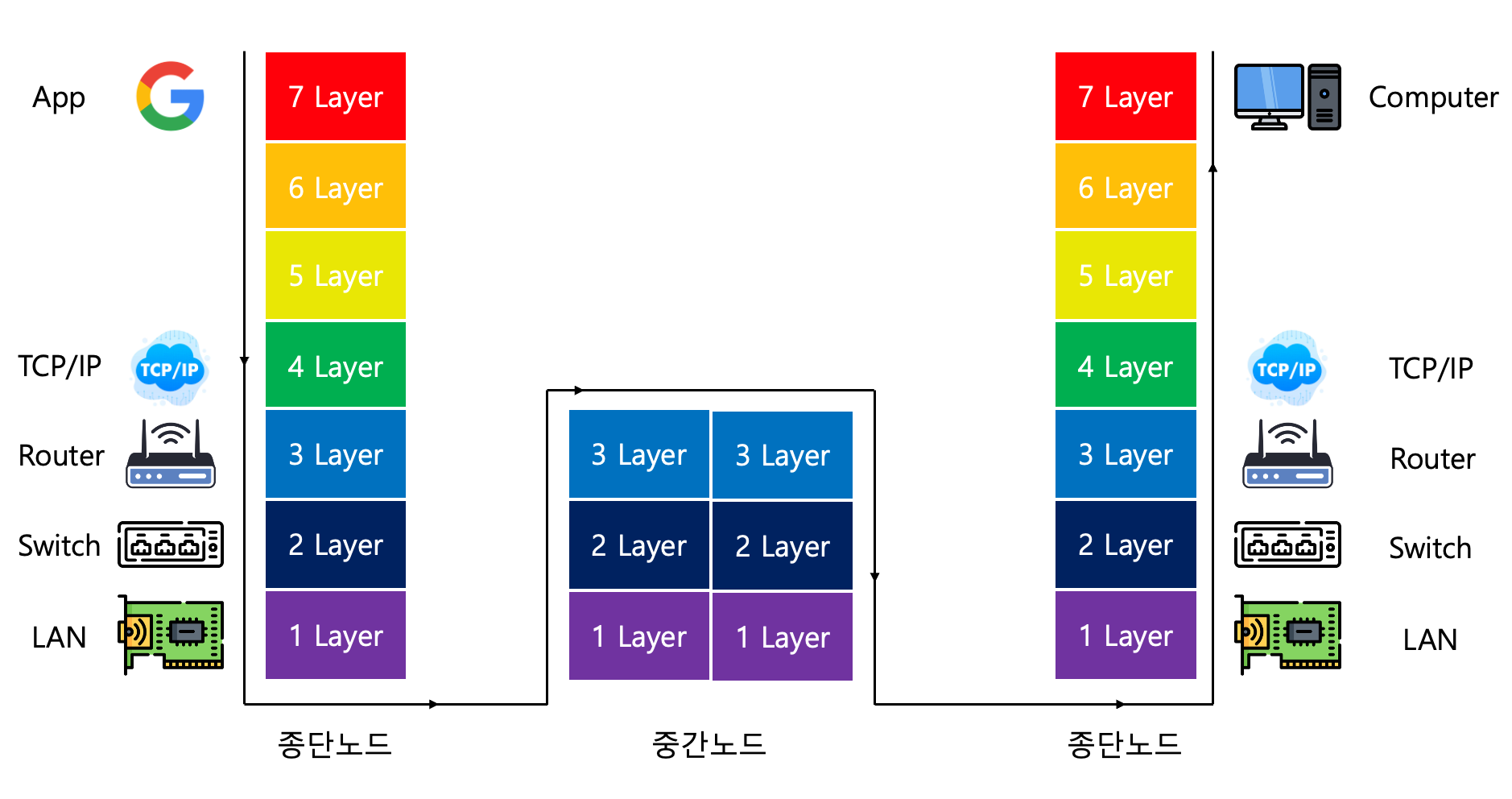 네트워크의 흐름에서도 패킷이 프레임에 담겼다가 풀어졌다가 다시 담겼다가를 반복합니다.