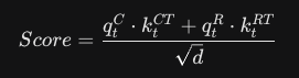 첫 번째 항은 압축된 캐시를 이용한 효율적인 문맥을 검색하고, 두 번째 항은 토큰의 위치를 찾기 위해 별도로 관리되는 정보 검색용이라고 생각하시면 됩니다. 이렇게 두개를 더한 값으로 Attention Score를 구하게 되는것이죠.