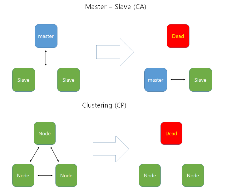 위의 그림은 RDBMS의 경우를 나타낸 그림입니다. 일반적인 마스터-슬레이브 관계인 경우 마스터 노드가 죽어버리면 남아있던 슬레이브 노드가 마스터가 되면서 다시 정상적인 운영을 합니다.