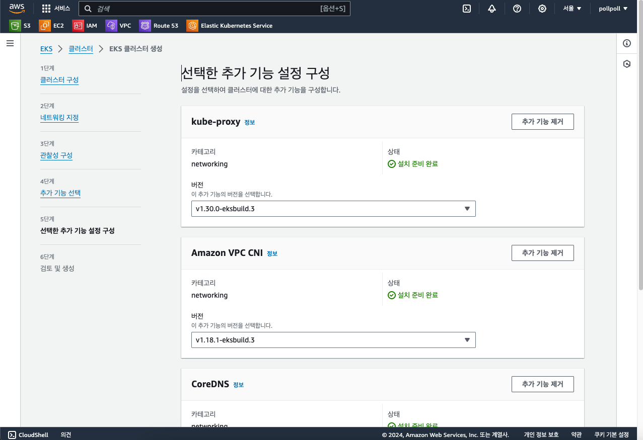 추가 기능을 선택할 때는 디폴트로 위의 사진처럼 네개가 선택되어있습니다. EKS Pod Identity는 파드에 접근하는 권한을 IAM으로 관리할 수 있도록 해주는 것인데 저는 일단 로컬PC인 맥북에서 클러스터에 접근할 거고 그 클러스터에 대한 접근을 IAM으로 관리할 것이지 파드에 관해서는 IAM이 필요없어서 선택하지 않았습니다.